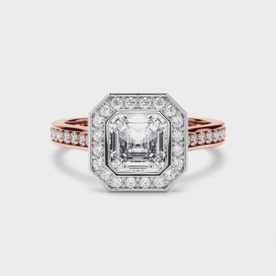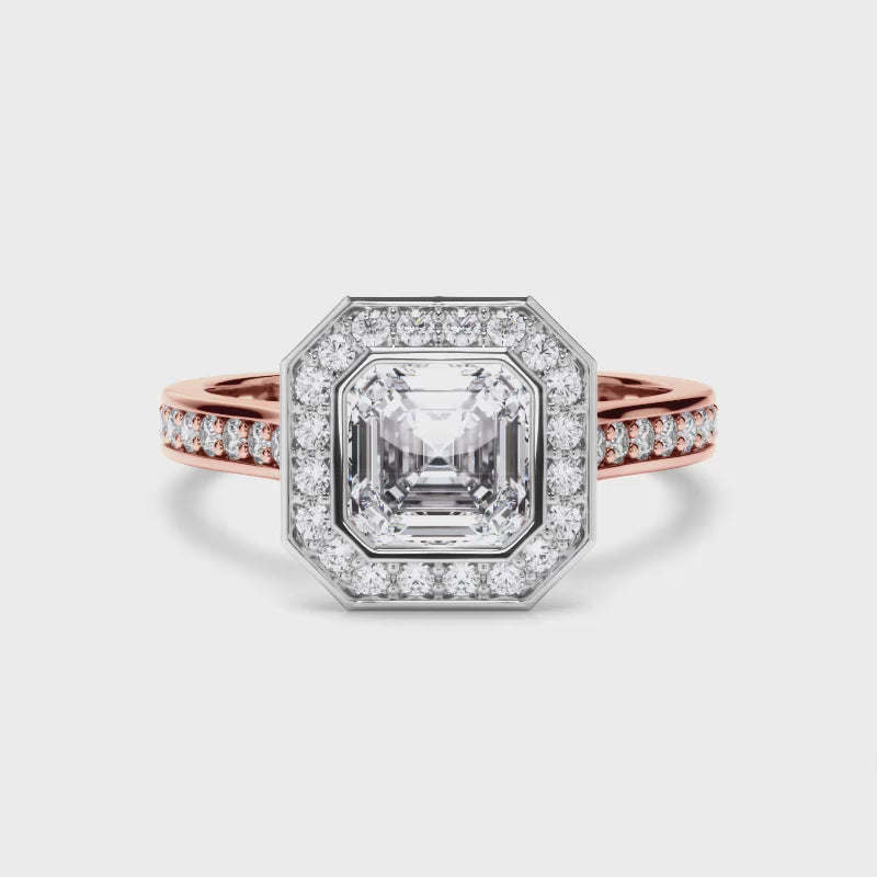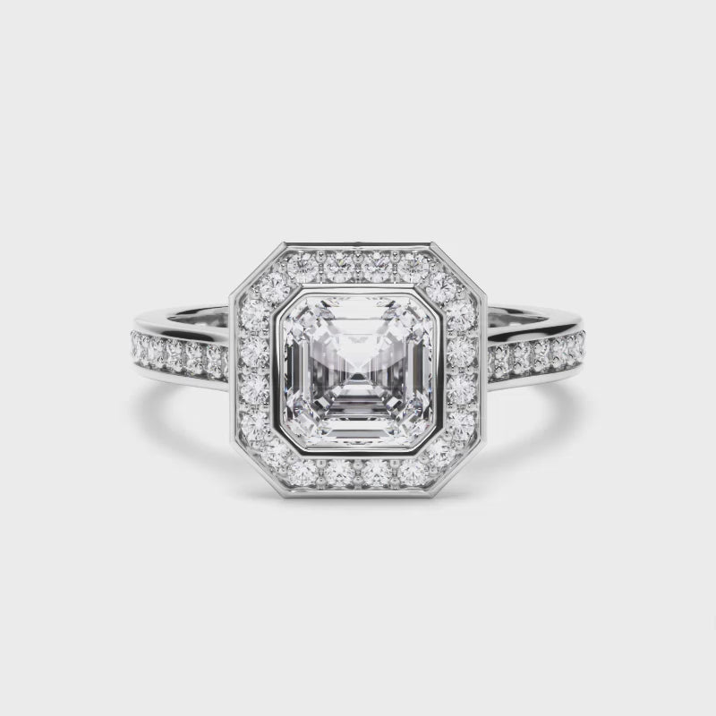 Asscher Diamond Engagement Ring with Bead Set Halo and Diamond Band