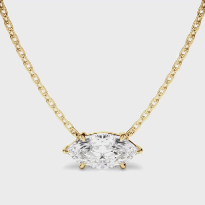 This elegant marquise cut diamond necklet, made with your choice of diamond centre stone, features an East West setting and includes a 45cm 18ct gold chain. Exuding fluidity in its line work, and boasting an elegant silhouette, as with all the pieces in our Bespoke Collection, this piece is made especially for you. Pictured here with a 1.50ct Marquise Cut Diamond, a final price is determined following your centre stone selection.