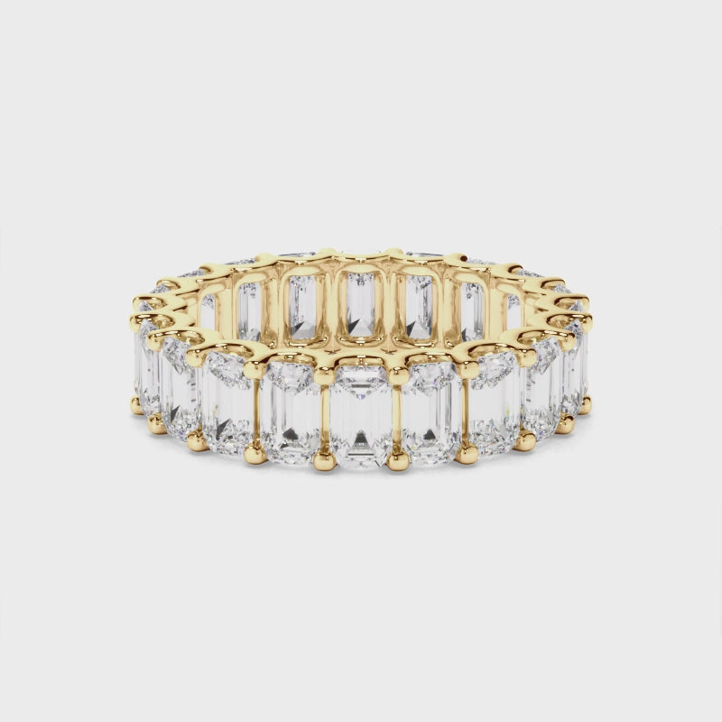 This stunning custom-made eternity ring features a full band of emerald cut diamonds set on an 18ct gold or platinum band. Exuding fluidity in its line work, and boasting an elegant silhouette, as with all the pieces in our Bespoke Collection, this piece is made especially for you.