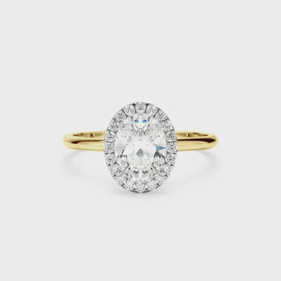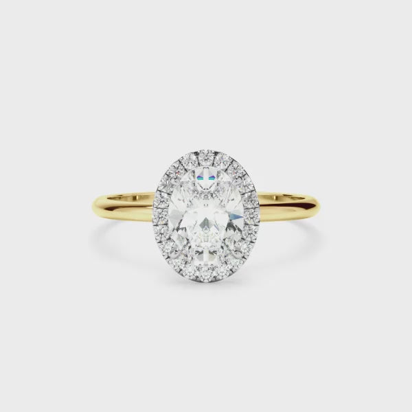This timeless custom-made engagement ring, made with your choice of diamond centre stone, features an oval cut diamond adorned in a halo of round brilliant cut diamonds. Exuding fluidity in its line work, and boasting an elegant silhouette, as with all the pieces in our Bespoke Collection, this piece is made especially for you.