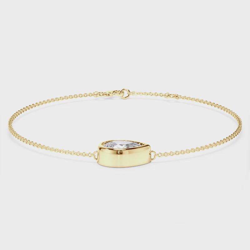 This timeless bezel set diamond bracelet, made with your choice of diamond centre stone, features a 1.00ct pear cut diamond set in 18ct gold. Exuding fluidity in its line work, and boasting an elegant silhouette, as with all the pieces in our Bespoke Collection, this piece is made especially for you.
