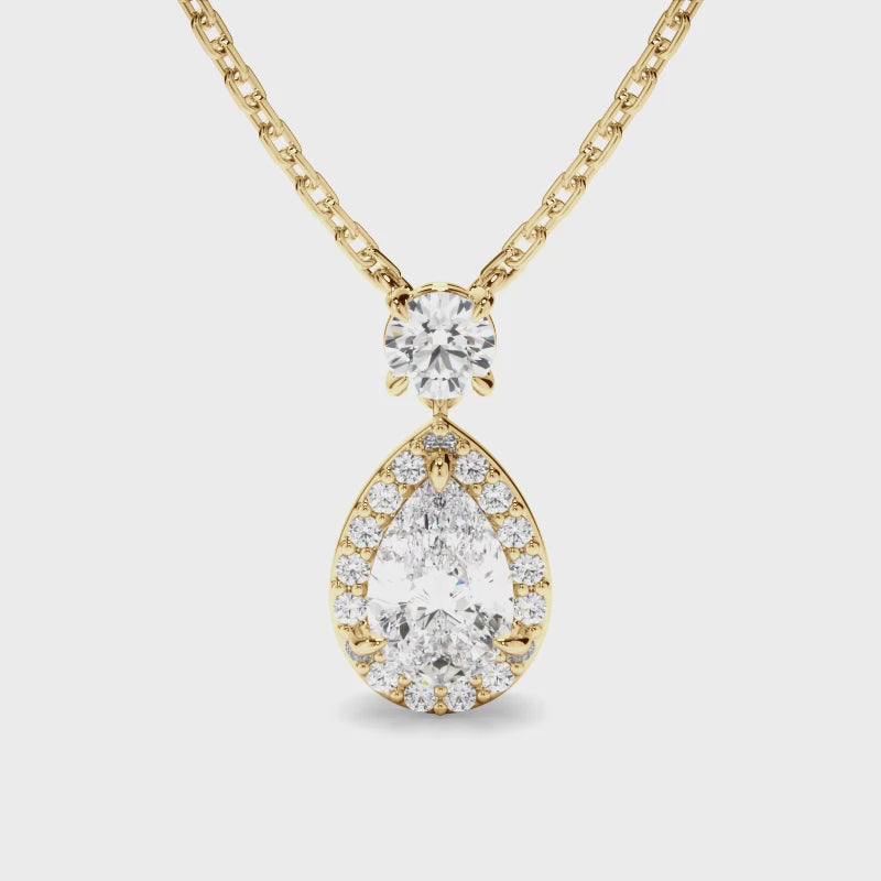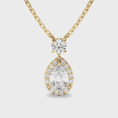 This elegant pear cut diamond halo drop pendant features a 1.00ct pear cut diamond, with 0.10ct round brilliant cut diamond halo, set below a 0.25ct round brilliant cut diamond. Exuding fluidity in its line work, and boasting an elegant silhouette, as with all the pieces in our Bespoke Collection, this piece is made especially for you.