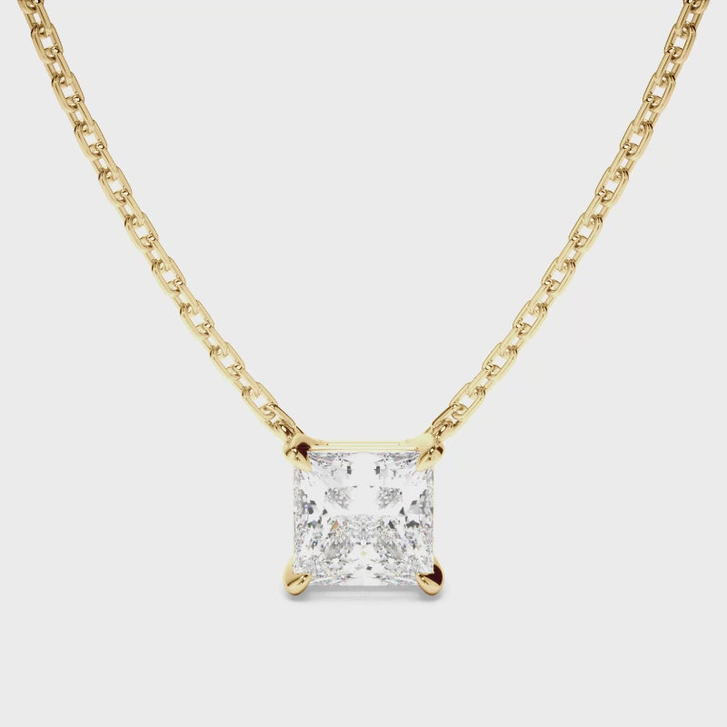 This elegant princess cut diamond necklet is made with your choice of diamond centre stone, and includes a 45cm 18ct gold chain. Exuding fluidity in its line work, and boasting an elegant silhouette, as with all the pieces in our Bespoke Collection, this piece is made especially for you. Pictured here with a 1.50ct Princess Cut Diamond, a final price is determined following your centre stone selection.