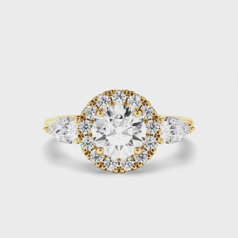 Round Brilliant Cut Diamond Halo Trilogy Engagement Ring with Pear Sides